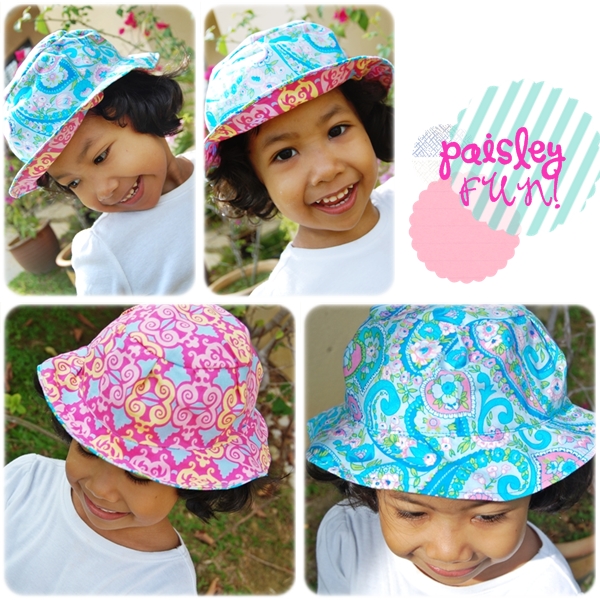 Now, this little miss wanted the same hat design but a different print. I was really surprised when she chose this Sis Boom paisley and not the many fun kiddie print I have in stash! She must be attracted to the bright colors. I paired it with a bright pink & blue print. These hats have pleats on top part of it which makes it very forgiving in any wonky-ness when sewing lol